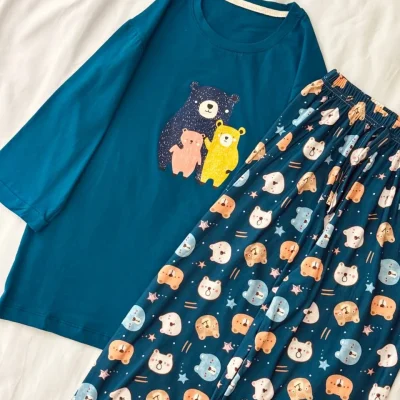 ست دو تیکه تیشرت و شلوار نخ پنبه ای  خرسی رنگی مناسب سایز ۳۶ تا ۴۴ قد تیشرت ۶۷ دور